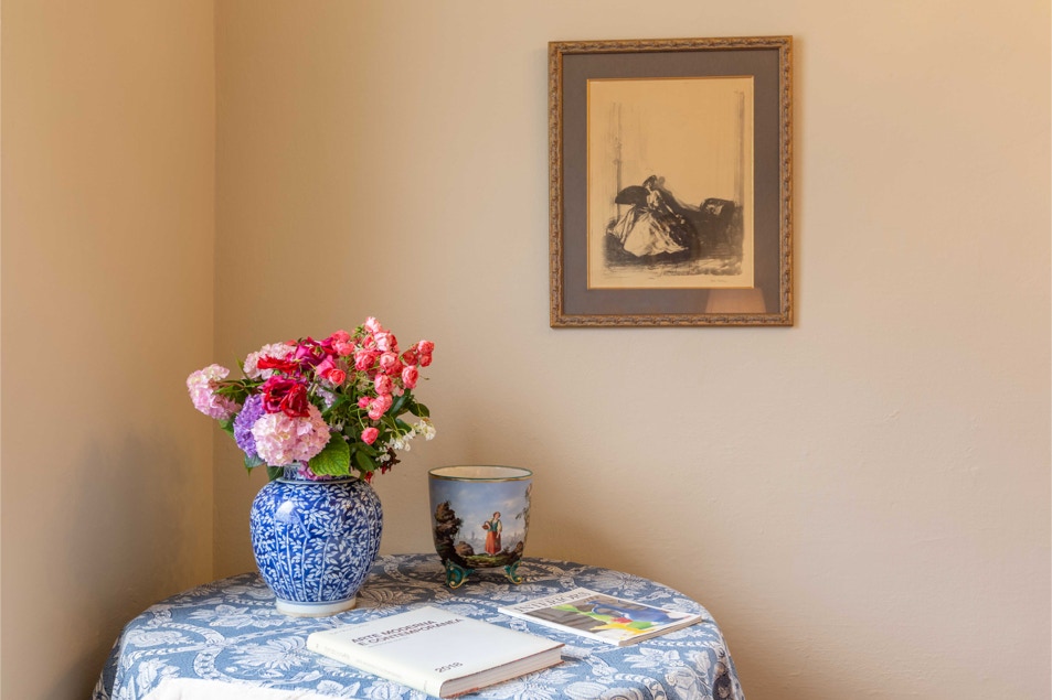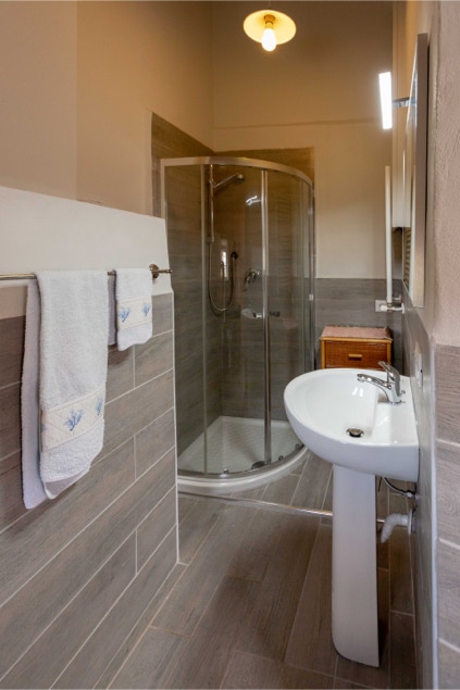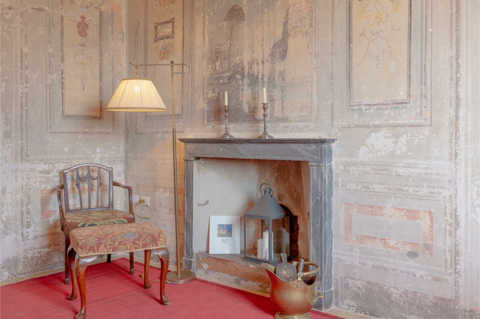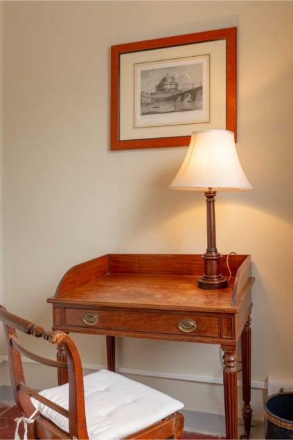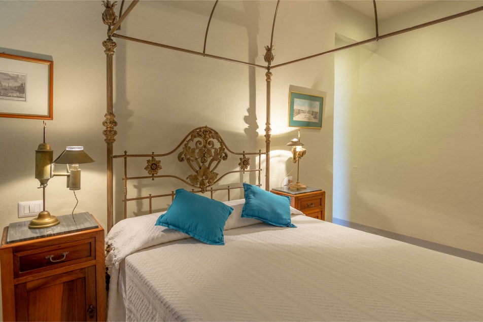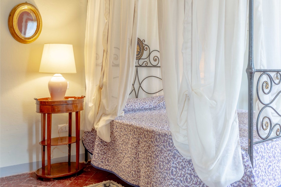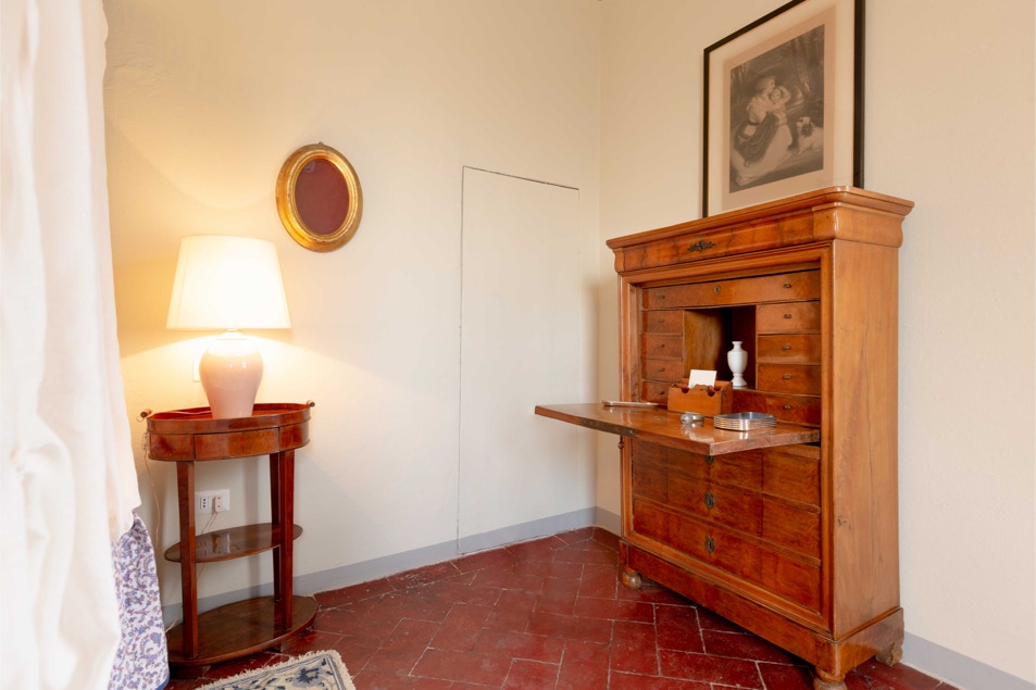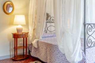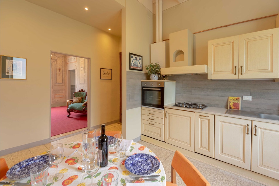 Appartamento al primo piano indipendente, composto da due camere matrimoniali, studio, cucina abitabile ed attrezzata, salotto con affreschi originali del 1800, bagno con doccia. Soffitti con travi a vista, pareti decorate, arredato con mobili d’epoca. Vista giardino.
