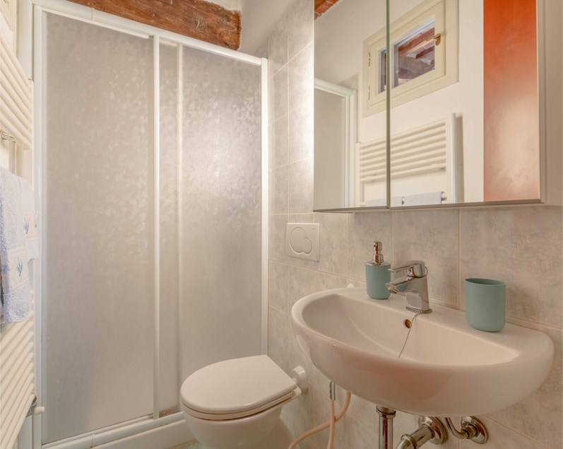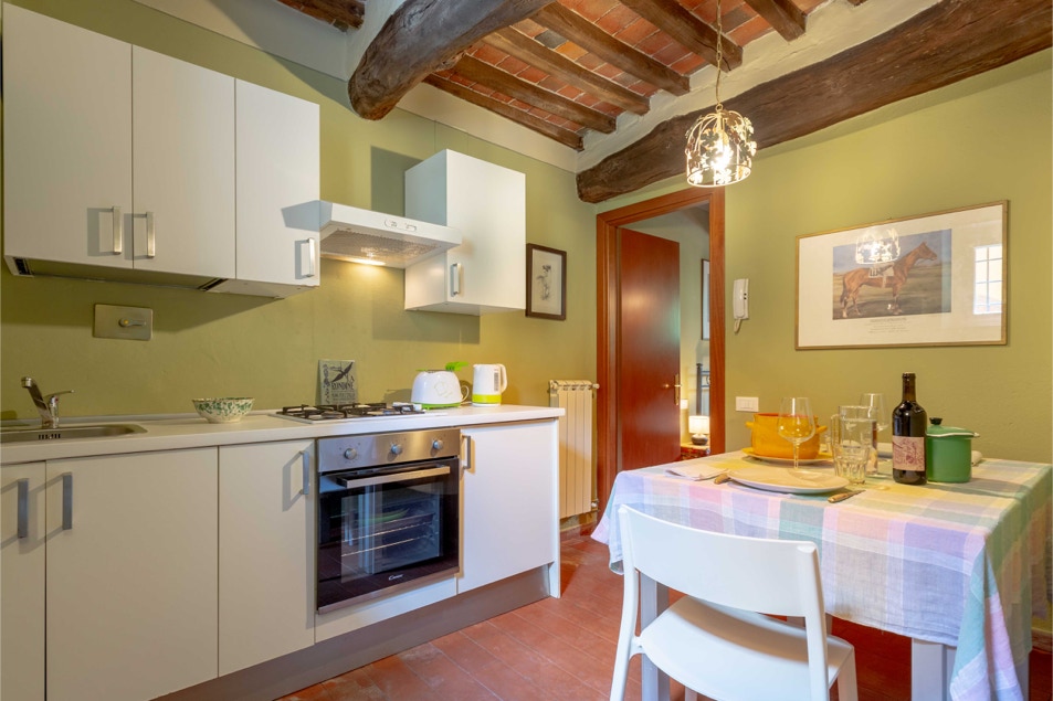 Romantico appartamento indipendente composto da una camera con letto matrimoniale, un bagno con doccia, una cucina attrezzata con tavolo per mangiare. Interamente arredato con travi a vista.