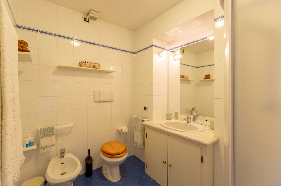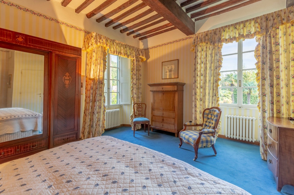 Camera matrimoniale classica con bagno privato e vista giardino, arredata con mobili d’epoca e moquette.